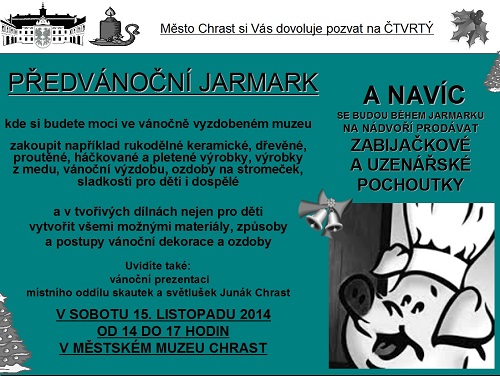 Nenechte si ujít čtvrtý Předvánoční jarmark, který se bude konat v prostorách Městského muzea Chrast v sobotu 15. listopadu 2014 od 14 do 17 hodin.